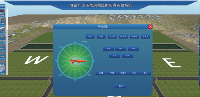 根據(jù)食品廠廠區(qū)規(guī)劃標(biāo)準(zhǔn)和選擇不同的地形、地區(qū)風(fēng)向玫瑰圖等環(huán)境要素,對(duì)食品廠區(qū)的生產(chǎn)車間、辦公樓、原料庫(kù)等設(shè)施設(shè)備進(jìn)行拖拽式布放,學(xué)習(xí)和訓(xùn)練食品廠區(qū)布局規(guī)劃。